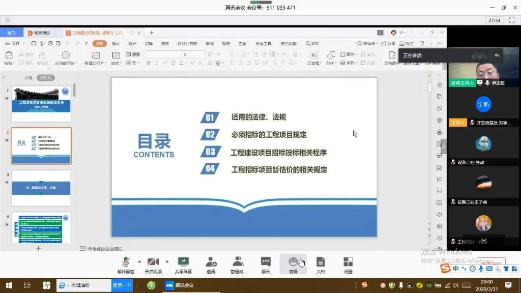 3月31日20時整,由尹總主講的“工程建設項目招標法規(guī)及實務”遠程視頻培訓會議開講了。