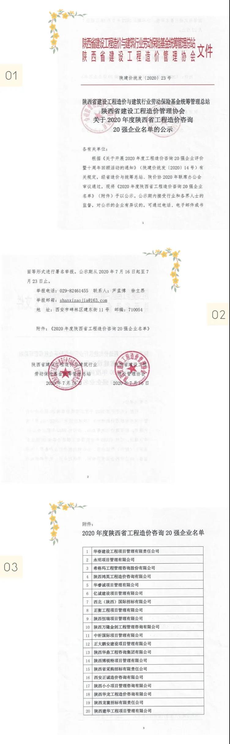2020年7月17日,陜西省建設(shè)工程造價(jià)管理協(xié)會(huì)(簡(jiǎn)稱(chēng)陜價(jià)協(xié))發(fā)布“關(guān)于2020年度陜西省工程造價(jià)咨詢(xún)20強(qiáng)企業(yè)名單的公示”,西北(陜西)國(guó)際招標(biāo)有限公司再次入圍,榮獲“第七名”。