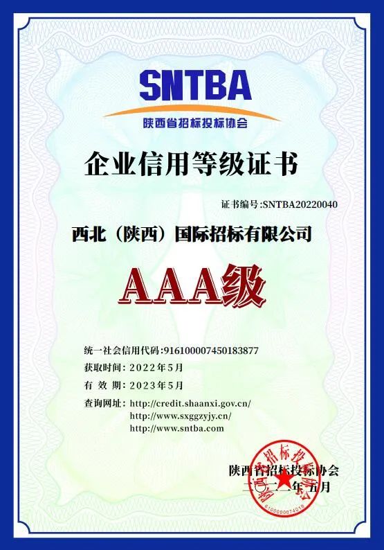 熱烈祝賀我公司榮獲2022年陜西省招投標(biāo)協(xié)會(huì)《AAA級(jí)企業(yè)信用等級(jí)證書(shū)》