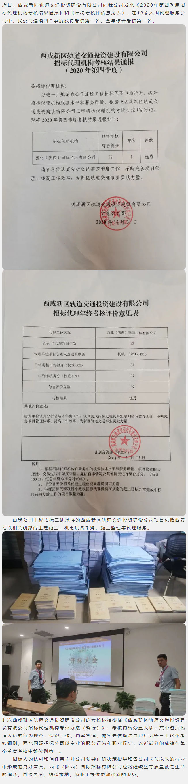 我公司獲西咸新區(qū)軌道交通投資建設(shè)有限公司《招標(biāo)代理機(jī)構(gòu)考核》全年綜合考核第一名