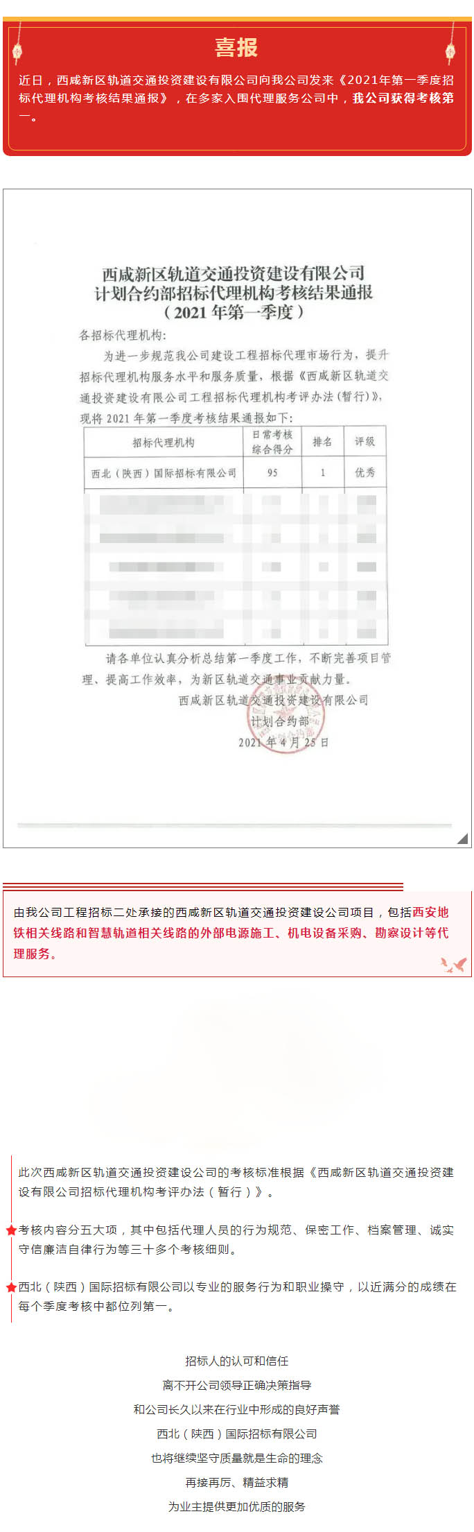 我公司獲西咸新區(qū)軌道交通投資建設(shè)有限公司《招標(biāo)代理機(jī)構(gòu)考核》2021年第一季度考核第一名