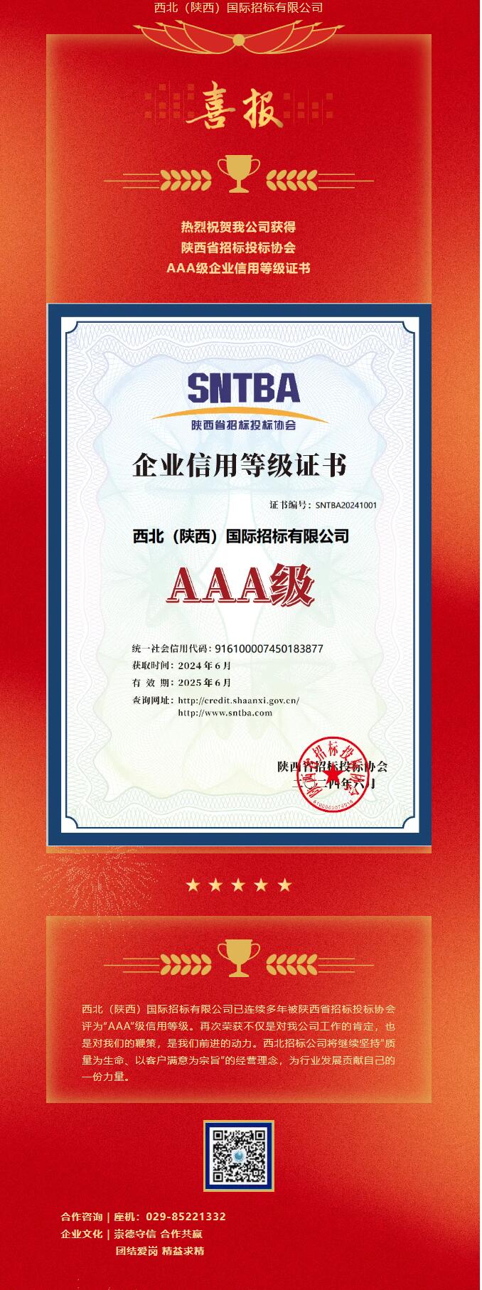 熱烈祝賀我公司獲得陜西省招標(biāo)投標(biāo)協(xié)會(huì)AAA級(jí)企業(yè)信用等級(jí)證書