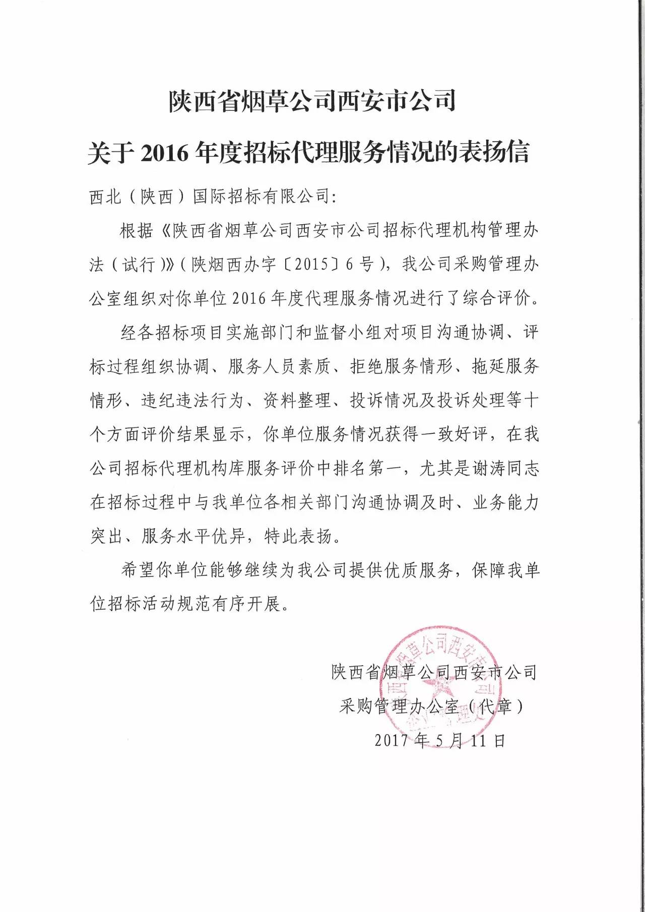 近日,我公司收到陜西省煙草公司西安市公司發(fā)來的表揚信。經過綜合評價,我公司被評為西安市煙草公司2016年度招標代理服務評價第一名。對我公司代理服務給予積極評價,對謝濤同志的工作給予熱情肯定!