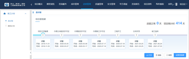 目前BIM中心已安排有序駐場。駐場后初步搭建了5D平臺,創(chuàng)建網(wǎng)頁端、項目云空間。目前已經(jīng)將網(wǎng)頁端權限開放至相關領導及部分業(yè)主代表,項目初期充分吸收各方意見,嘗試探索工作的深度廣度。通過和廣聯(lián)達公司深入溝通,成功在網(wǎng)頁端添加施工總計劃、設置項目里程碑,使得項目計劃與重要時間節(jié)點一目了然。
