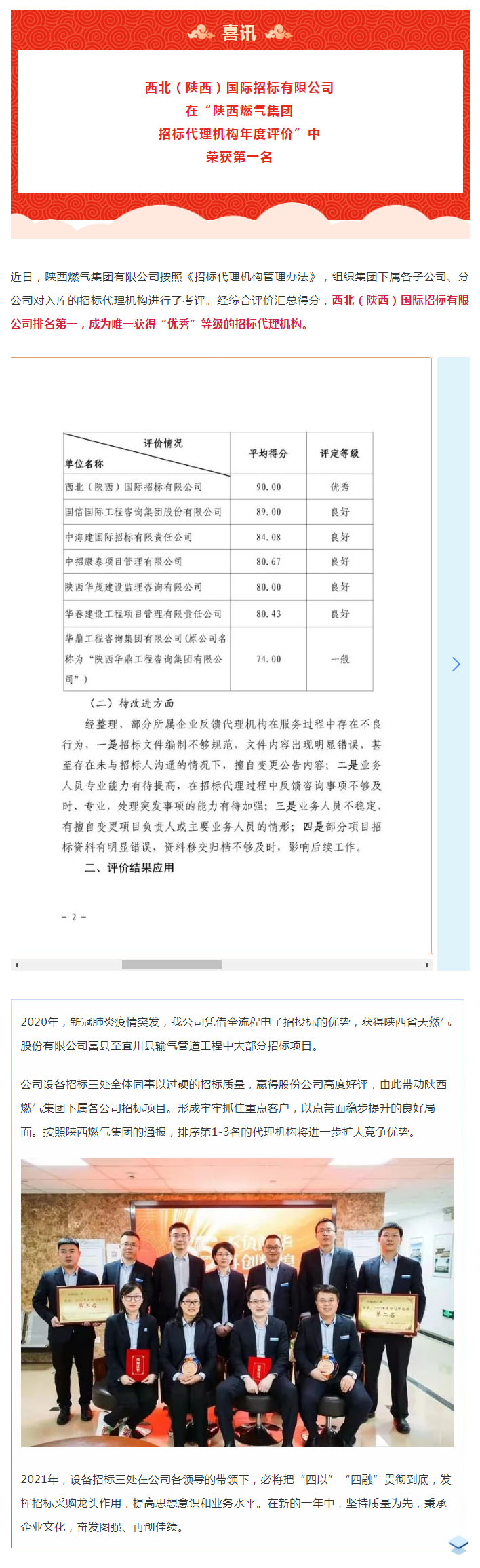 我公司在“陜西燃?xì)饧瘓F(tuán) 招標(biāo)代理機(jī)構(gòu)年度評(píng)價(jià)”中 榮獲第一名