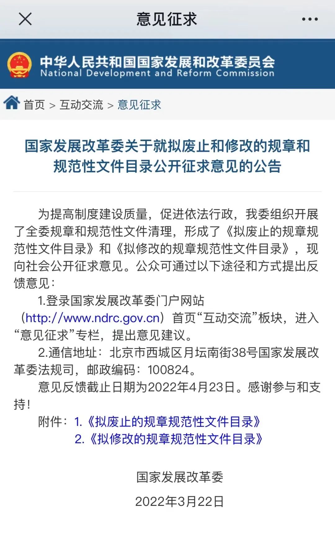 近日,國家發(fā)展改革委發(fā)布《關(guān)于就擬廢止和修改的規(guī)章和規(guī)范性文件目錄公開征求意見的公告》(以下簡稱《征求意見》),以提高制度建設(shè)質(zhì)量,促進(jìn)依法行政。