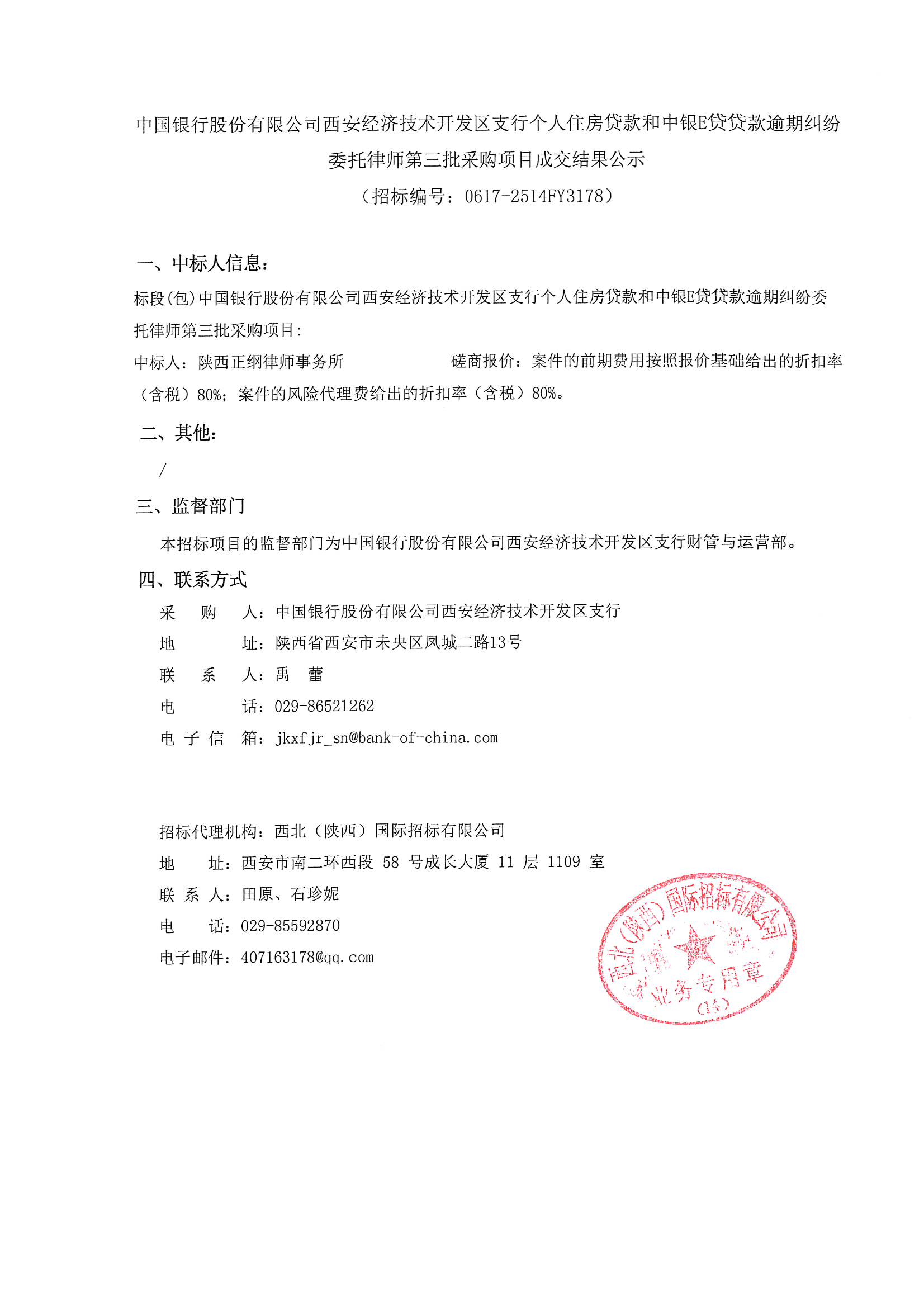 中國(guó)銀行股份有限公司西安經(jīng)濟(jì)技術(shù)開發(fā)區(qū)支行個(gè)人住房貸款和中銀E貸貸款逾期糾紛委托律師第三批采購(gòu)項(xiàng)目成交結(jié)果公示